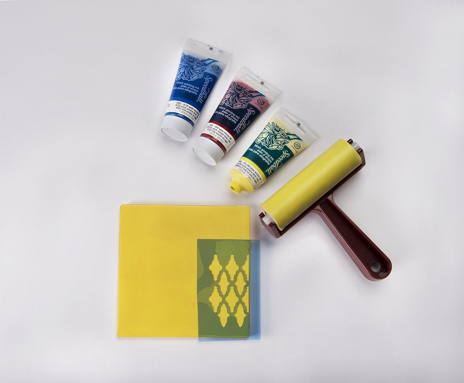 • CONTENTS – This starter kit contains 5”x 5" Speedball gel printing plate, x4 37cc 1.25oz Speedball water-soluble block printing inks in colours black, red, blue, and yellow, 37cc 1.25oz Speedball water-soluble block printing ink retarder, 4-inch pop-in soft rubber brayer and an instructional reference guide.